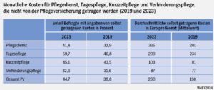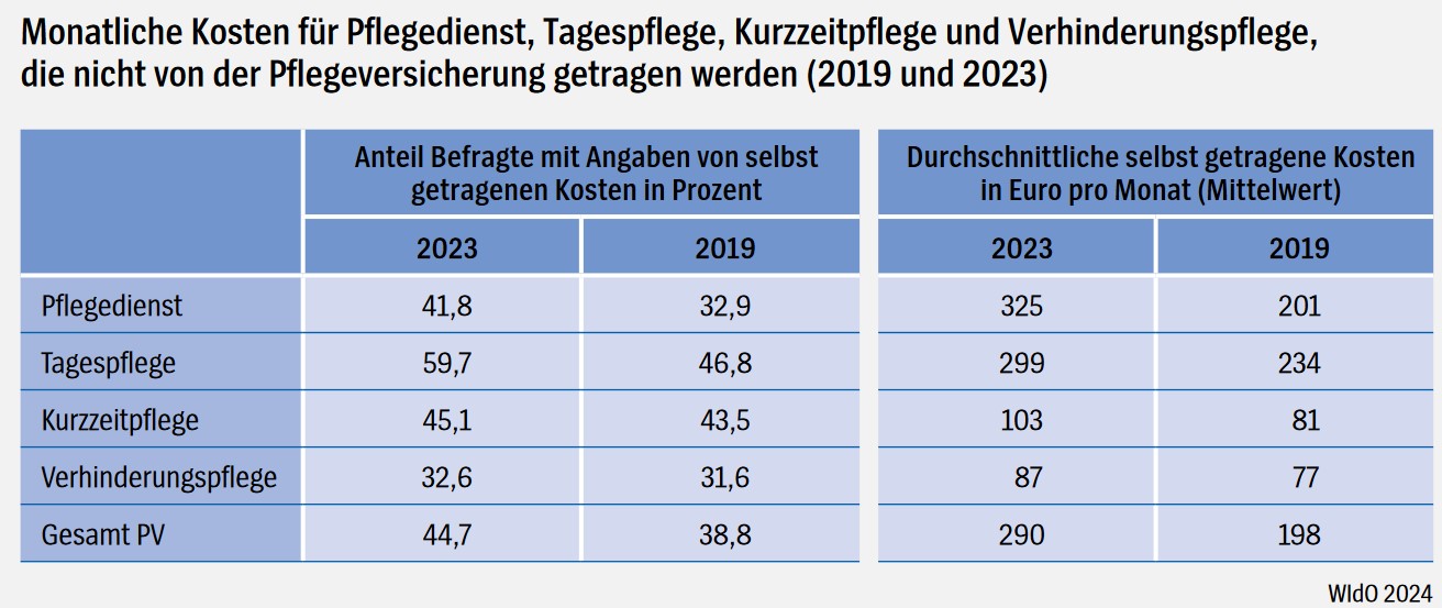 In der Befragung von 2023 gab weniger als die Hälfte (45 Prozent) der Teilnehmenden an, es seien Kosten für Leistungen wie zum Beispiel den Pflegedienst oder die Tagespflege entstanden, die nicht von der Pflegekasse übernommen oder erstattet wurden. 2019 war dieser Anteil mit 39 Prozent etwas geringer.