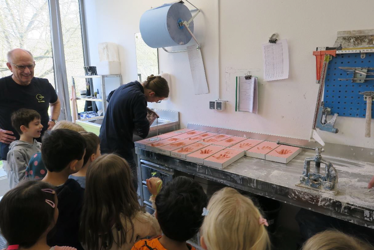 Kleine Gesundheitshandwerker beobachten Sarah Frank beim Ausgießen der Handabdrücke mit Gips.